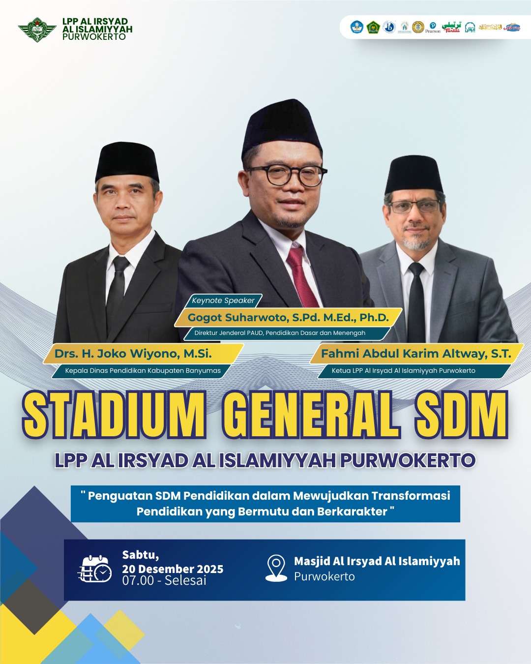 Purwokerto, 20 Desember 2025 — Semangat perubahan dan komitmen terhadap pendidikan berkualitas kembali digaungkan dalam Stadium General SDM yang diselenggarakan oleh LPP Al Irsyad Al Islamiyyah Purwokerto. Bertempat di Masjid Al Irsyad Al Islamiyyah, acara ini menjadi momentum penting dalam memperkuat sumber daya manusia pendidikan demi mewujudkan transformasi yang bermutu dan berkarakter.